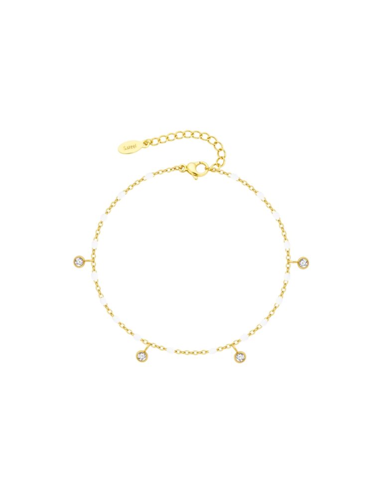 Bracelet raffiné en acier inoxydable doré avec billes en émail et strass sur chaîne ajustable.