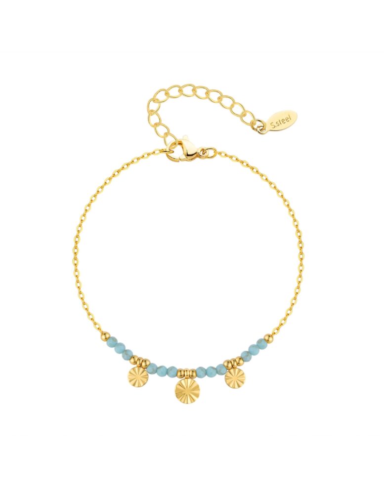 Bracelet fin en acier inoxydable doré avec pierres naturelles pendentifs martelés et chaînette d’extension réglable.