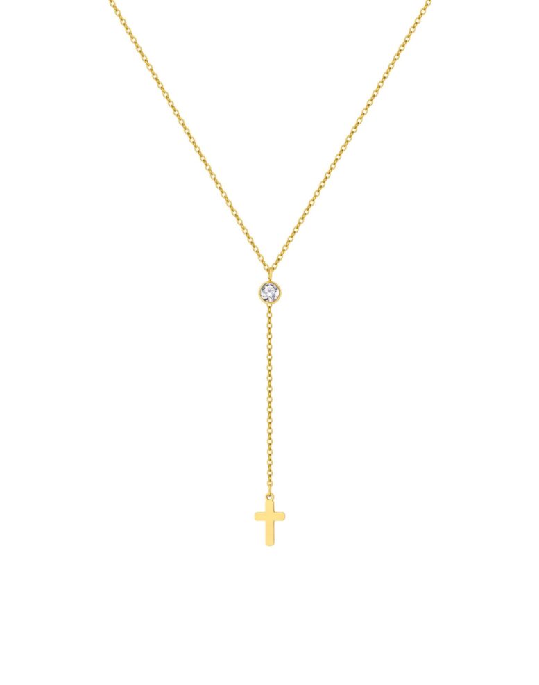 Collier en acier inoxydable en forme d'Y avec un grand strass et un pendentif en forme de croix