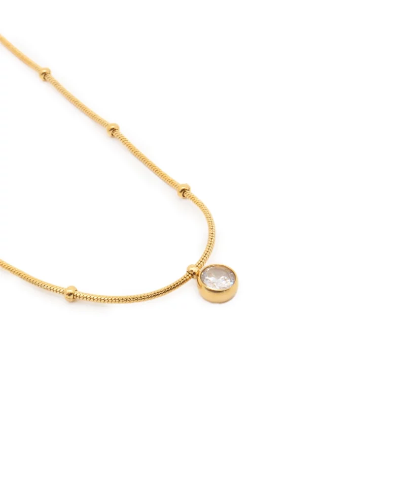 Collier en acier inoxydable, avec un pendentif en strass. Disponible en doré ou en argenté.